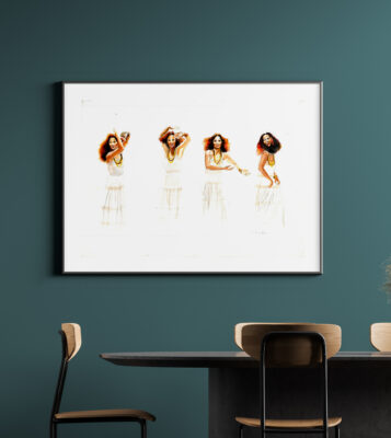 Nesta obra, busco imortalizar a presença de Clara Nunes, a voz que uniu o Brasil ao axé dos terreiros. Utilizei a fluidez da aquarela para representar Clara em quatro tempos de dança e devoção, como se sua imagem estivesse se materializando através do som.