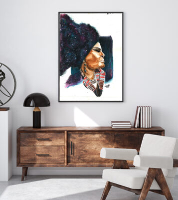 Nesta obra, retrato a imensidão de Elza Soares, uma mulher que foi, em si mesma, um acontecimento. Capturo a transição da dor em poder: o turbante, que nasce das texturas e cores de uma galáxia, simboliza que Elza não veio apenas do “Planeta Fome”, mas de um universo de resistência e genialidade que desafia o tempo.