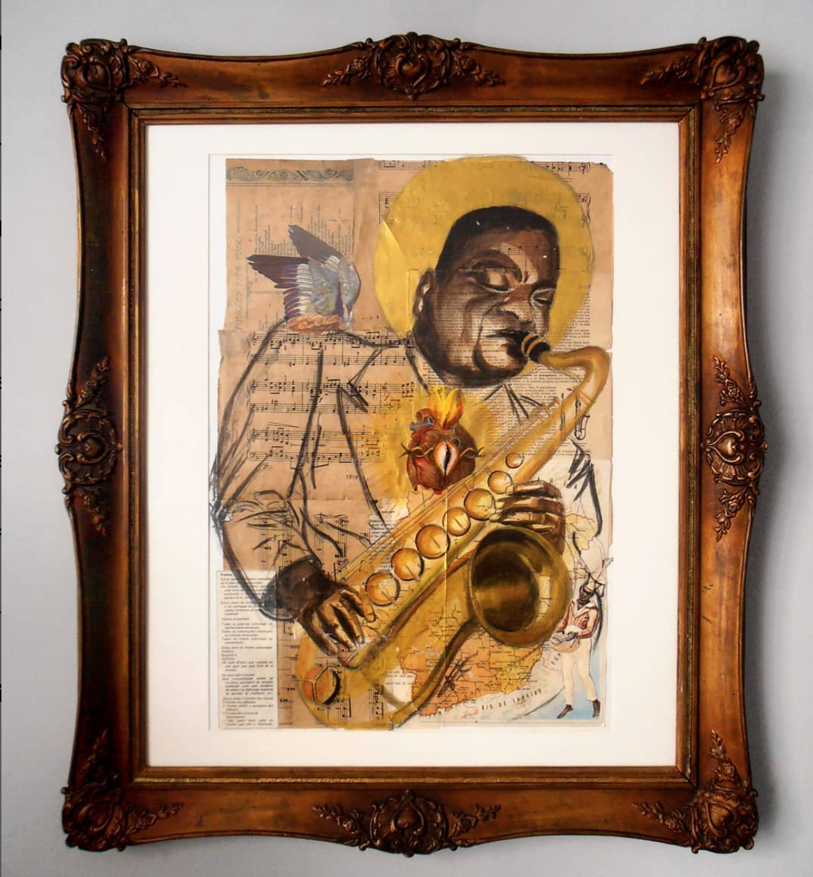 Nesta obra, busco canonizar visualmente aquele que é o verdadeiro santo padroeiro da nossa sonoridade: Pixinguinha. Esta peça é um exercício de arqueologia e devoção; utilizei partituras originais da década de 30, resgatadas literalmente do chão das ruas da Lapa. Esses fragmentos, que pertenceram a uma antiga casa de instrumentos, carregam o pó e a memória do tempo em que o mestre moldava a nossa música nas noites cariocas.