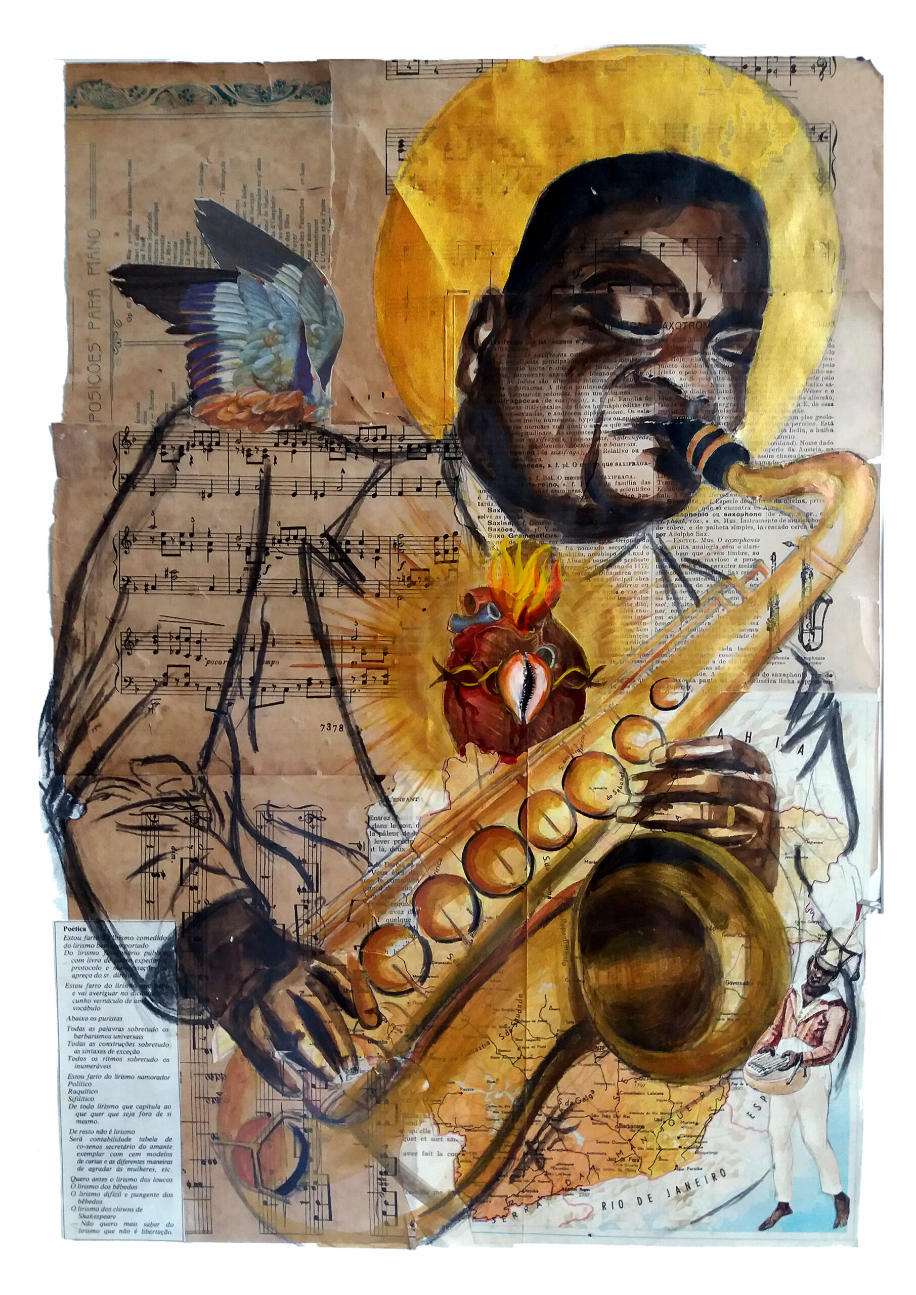 Santo Pixinguinha Téc: aquarela, carvão e acrílica sobre partituras. Tam: 68cm x 79cm Ano:2018