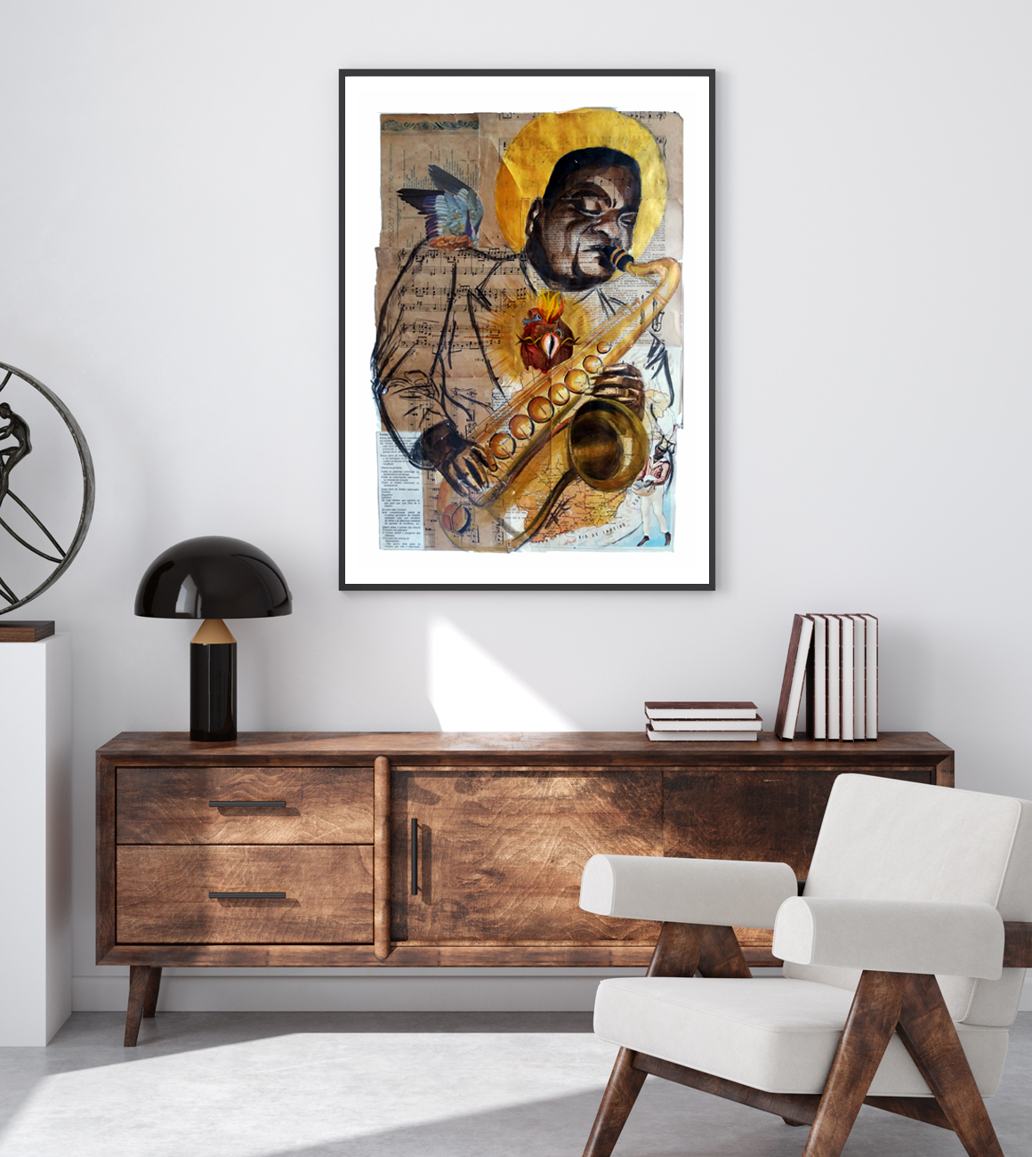 No centro da composição, o coração em chamas faz uma referência direta ao Sagrado Coração de Cristo, mas com uma subversão fundamental: um búzio ocupa o centro de tudo. Esse elemento traz o axé e a consulta ao sagrado africano para o núcleo da vida do mestre. Pixinguinha aparece com seu saxofone sob um halo dourado, transformando o sopro em uma benção que emana desse coração sincrético. Na Ori Lab83, esta obra é um altar que une a rua e o templo, celebrando o homem que é a própria base onde toda a nossa identidade musical foi escrita.